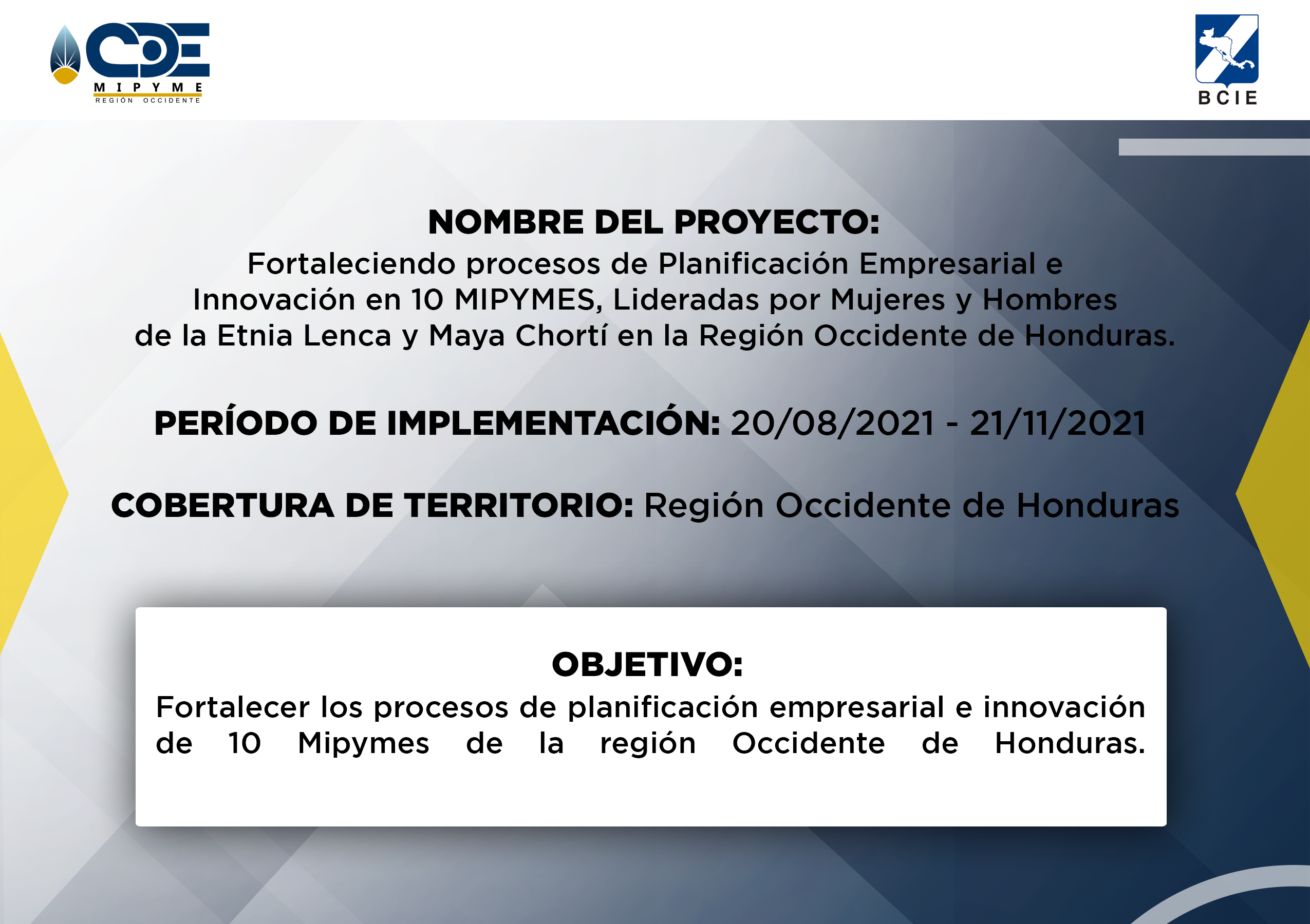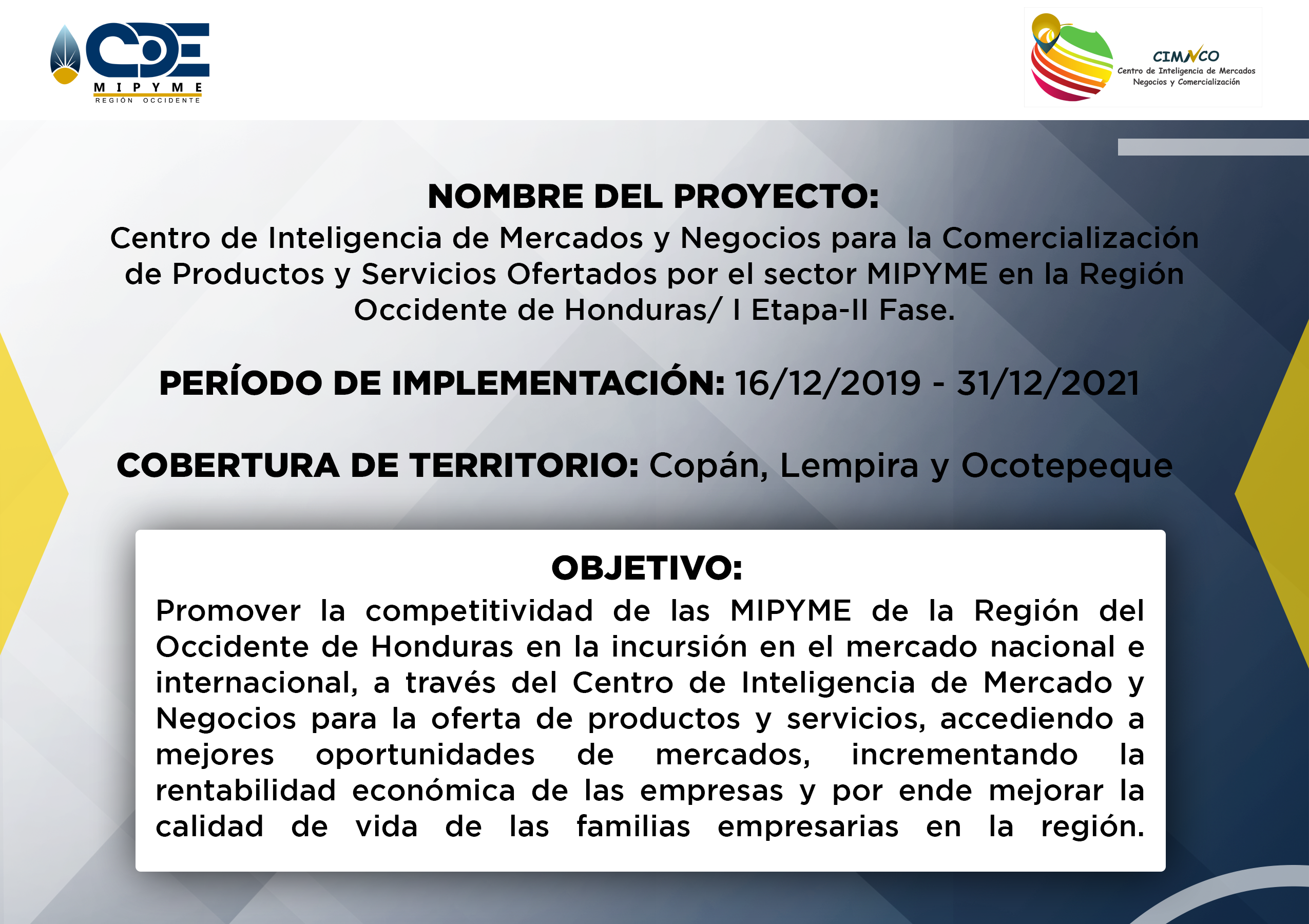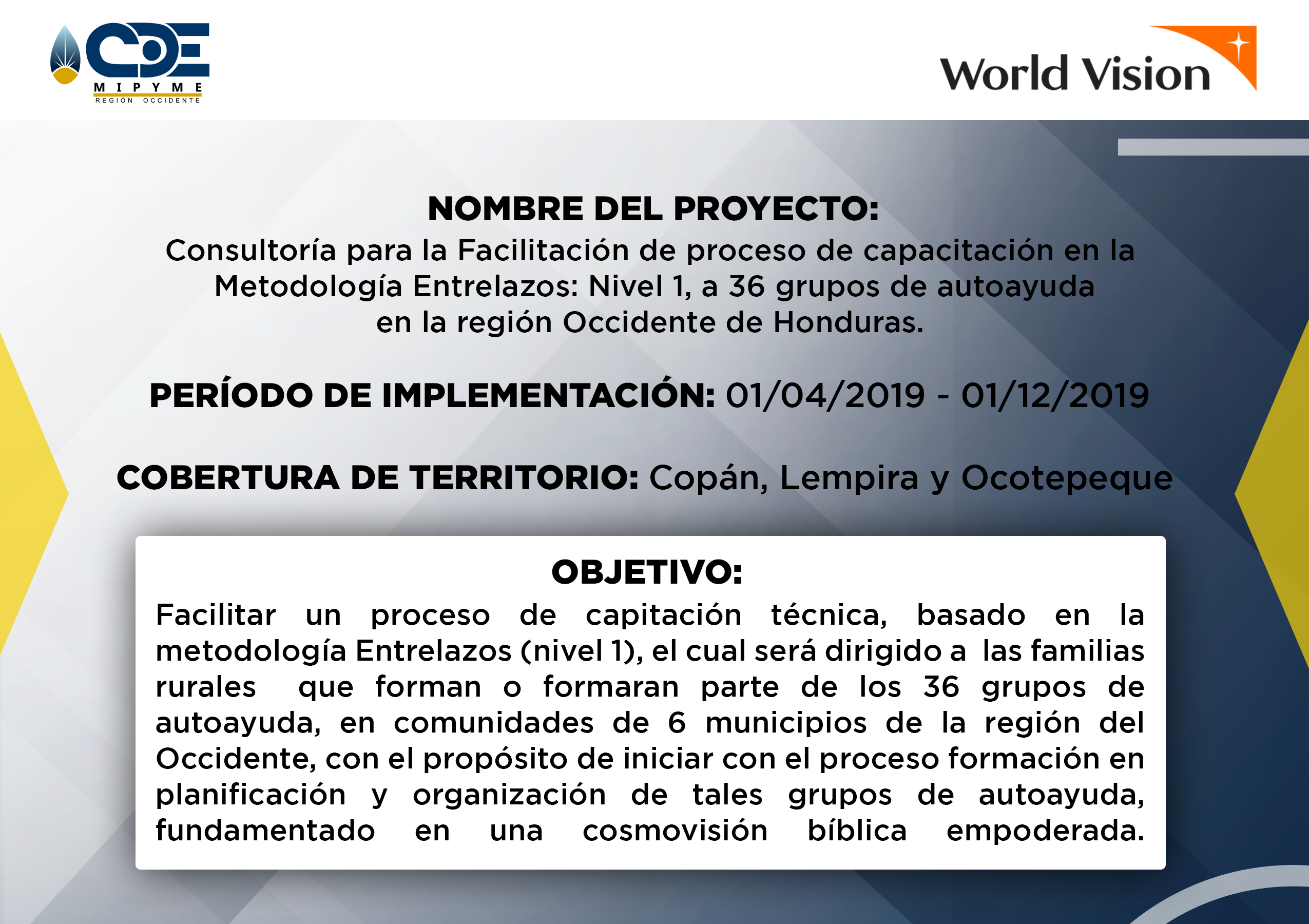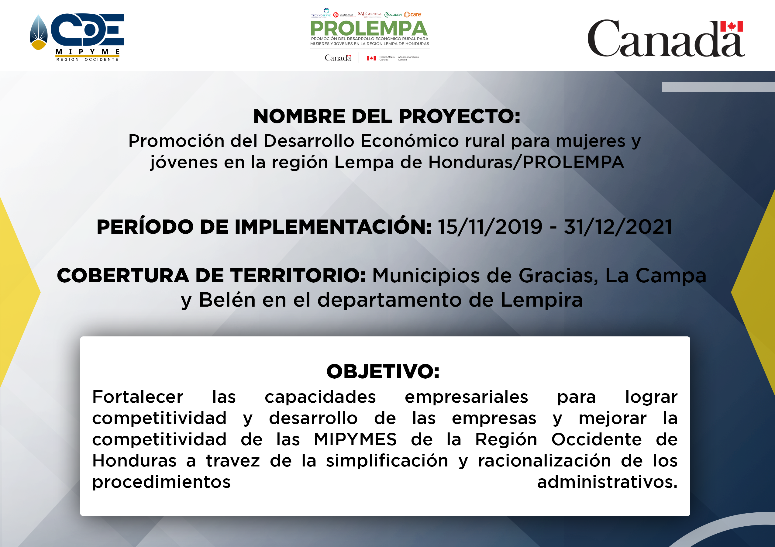 - CDE MIPYME Región Occidente ha realizado la ejecución de varios proyectos a lo largo de la operatividad institucional. Proyectos que benefician a los emprendedores de la zona, fortaleciendo la capacidad productiva e impulsando la economia de la zona. Se generan alianzas a nivel de ONGs con presencia en la región, para ejecutar acciones complementarias en apoyo a emprendimientos y empresas asistidas en los territorios de intervención; asimismo, se ofrecen servicios de asesoría y capacitación empresarial especializada en otros territorios donde no existe presencia institucional, y se demanda de tales servicios en el marco de programas o proyectos implementados por las ONGs.