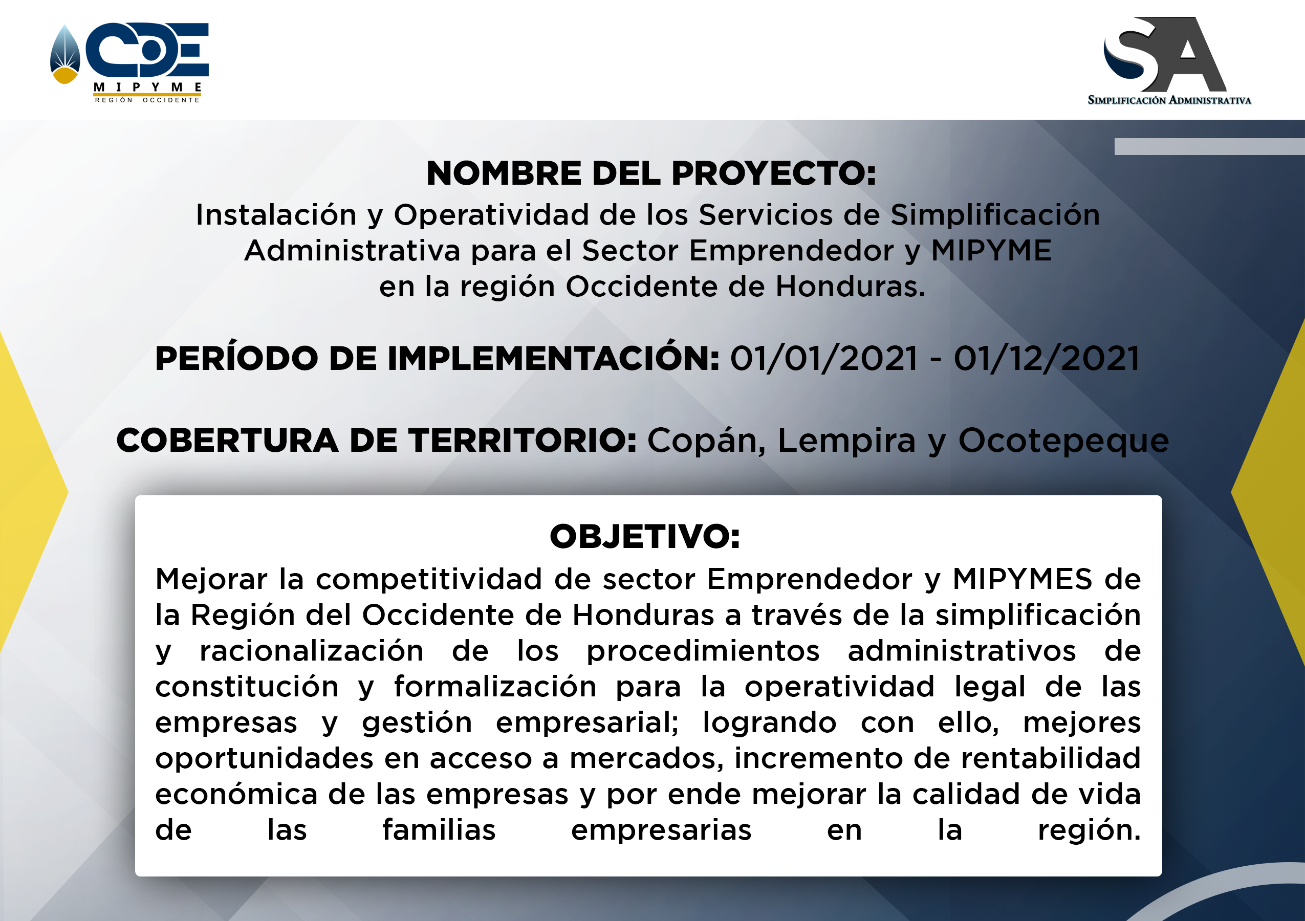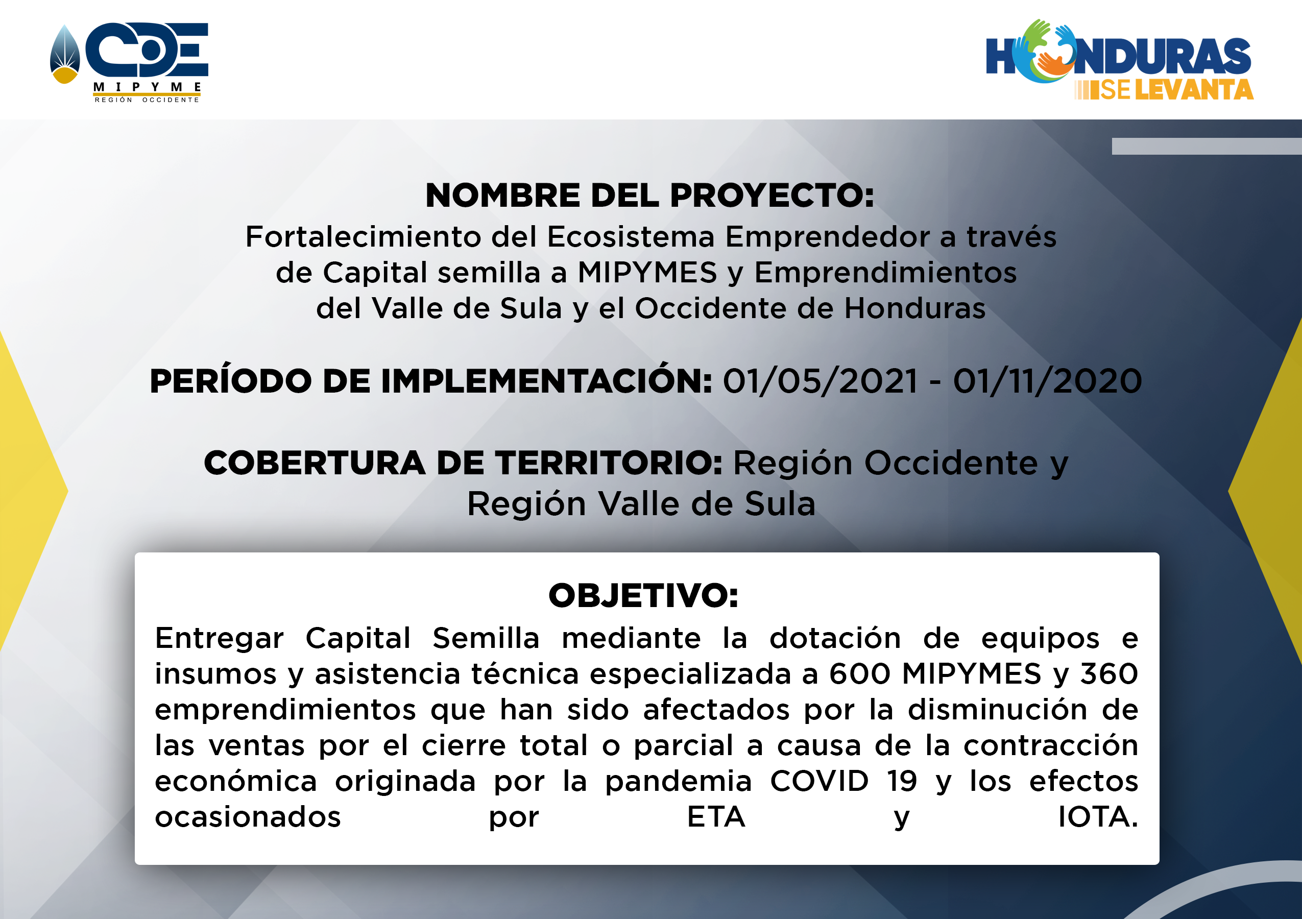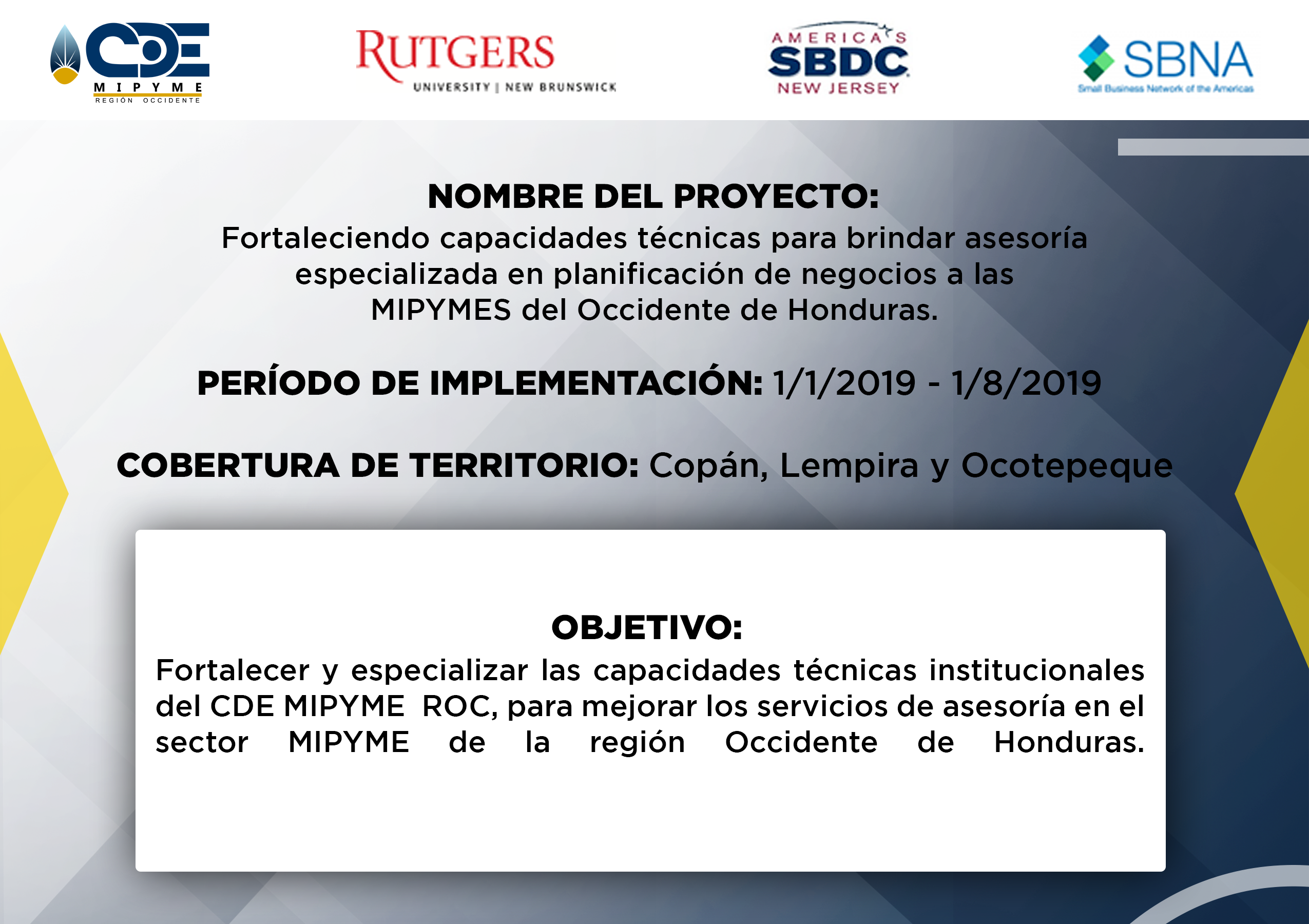 - CDE MIPYME Región Occidente ha realizado la ejecución de varios proyectos a lo largo de la operatividad institucional. Proyectos que benefician a los emprendedores de la zona, fortaleciendo la capacidad productiva e impulsando la economia de la zona. Se generan alianzas a nivel de ONGs con presencia en la región, para ejecutar acciones complementarias en apoyo a emprendimientos y empresas asistidas en los territorios de intervención; asimismo, se ofrecen servicios de asesoría y capacitación empresarial especializada en otros territorios donde no existe presencia institucional, y se demanda de tales servicios en el marco de programas o proyectos implementados por las ONGs.