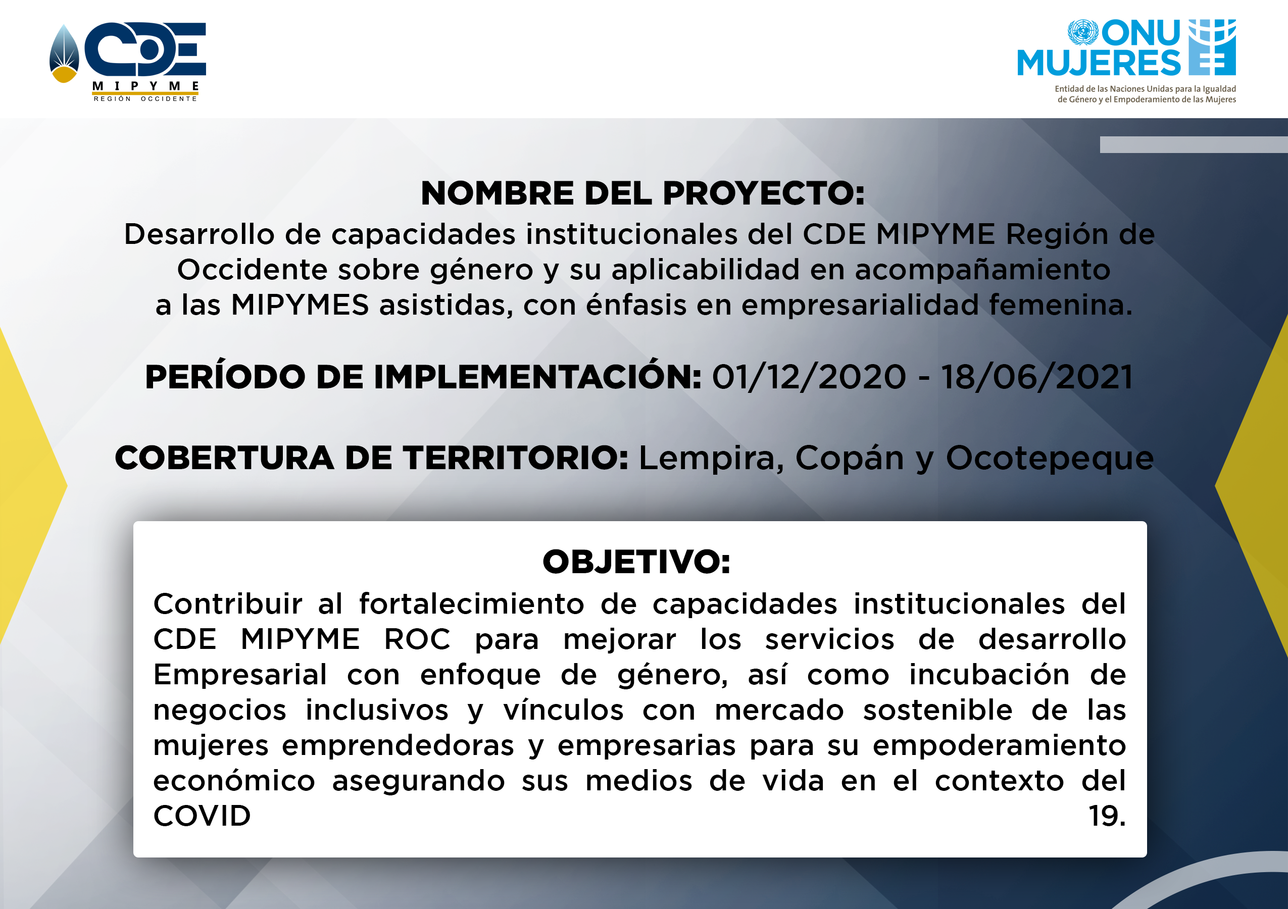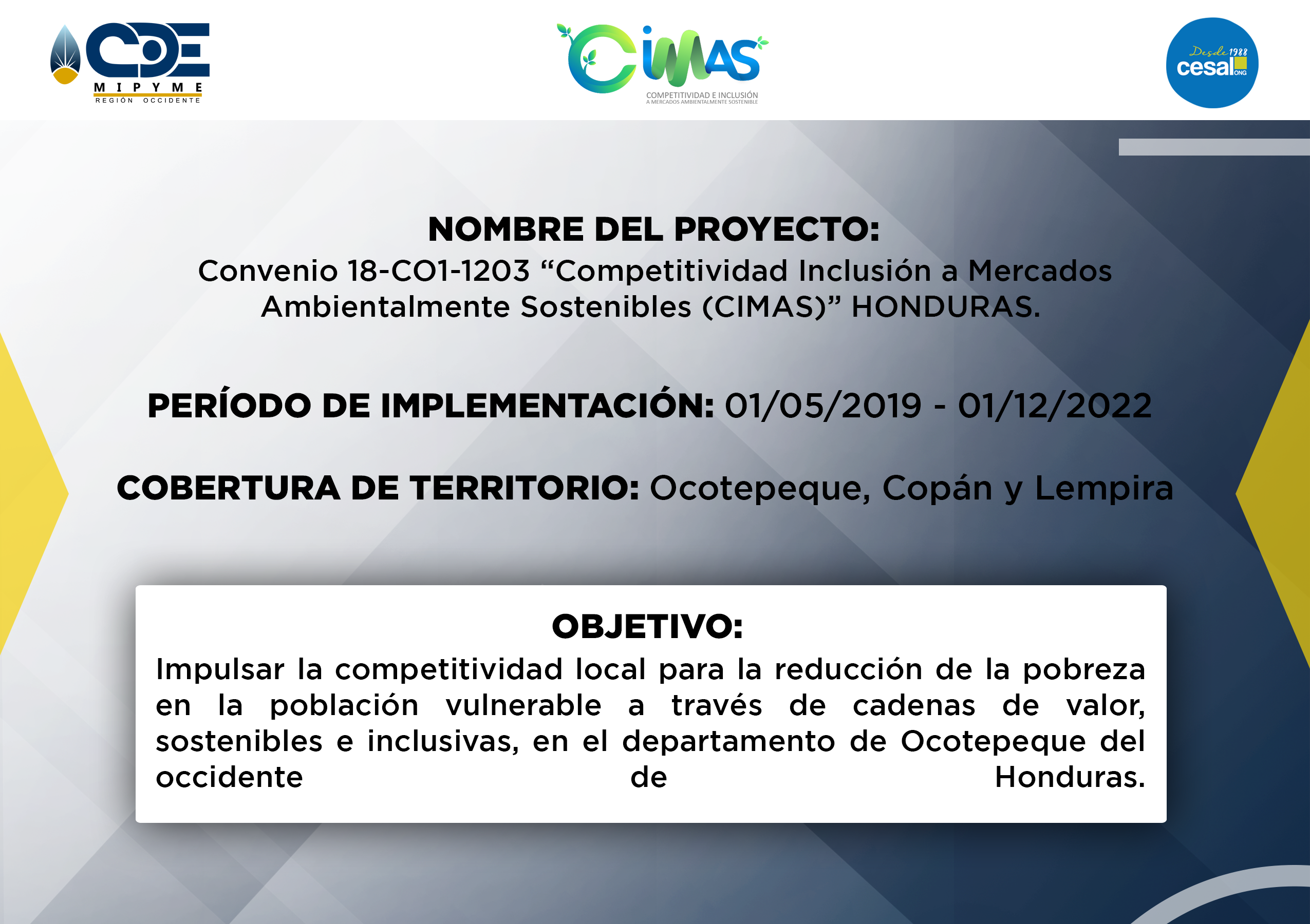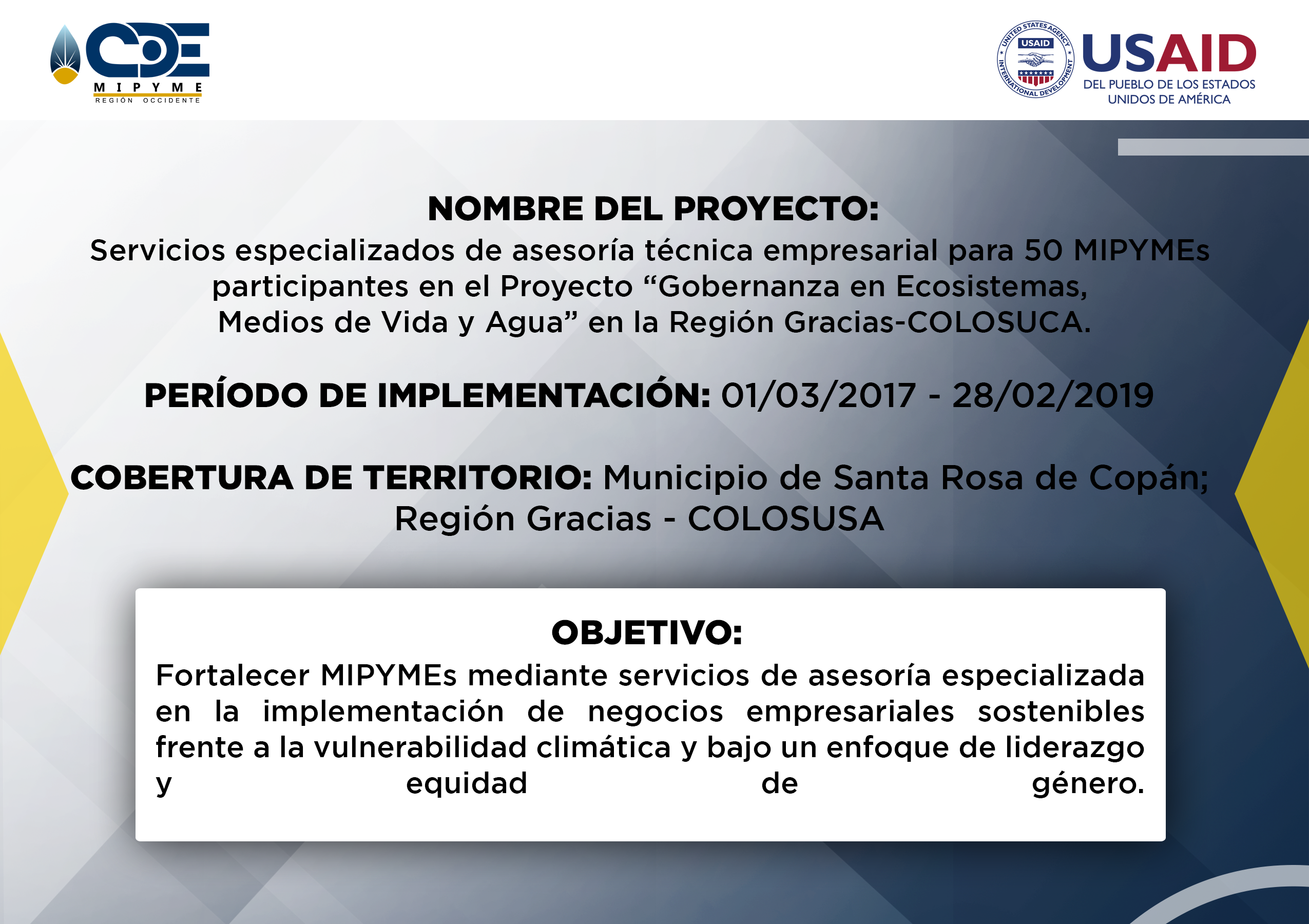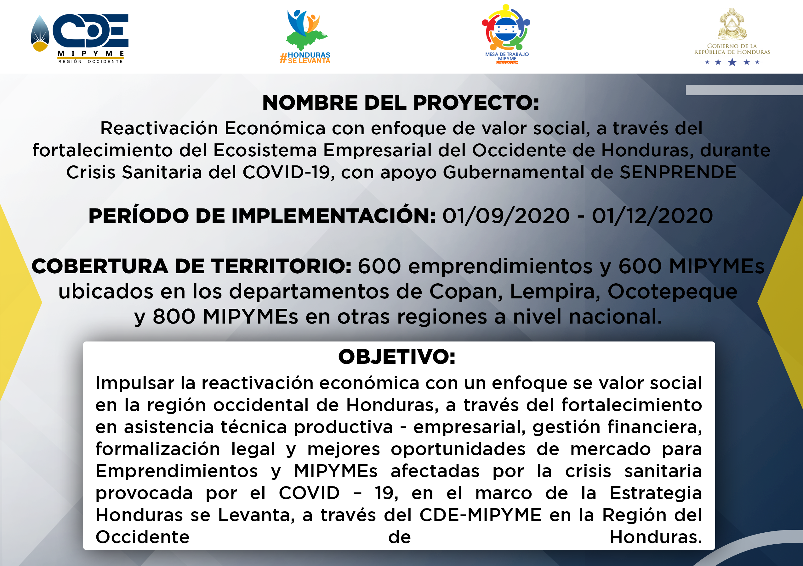 - CDE MIPYME Región Occidente ha realizado la ejecución de varios proyectos a lo largo de la operatividad institucional. Proyectos que benefician a los emprendedores de la zona, fortaleciendo la capacidad productiva e impulsando la economia de la zona. Se generan alianzas a nivel de ONGs con presencia en la región, para ejecutar acciones complementarias en apoyo a emprendimientos y empresas asistidas en los territorios de intervención; asimismo, se ofrecen servicios de asesoría y capacitación empresarial especializada en otros territorios donde no existe presencia institucional, y se demanda de tales servicios en el marco de programas o proyectos implementados por las ONGs.
